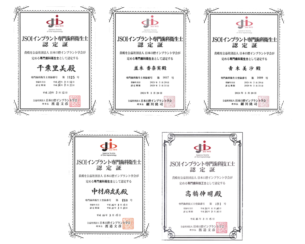 さらに、インプラントの上部構造物の技工は院長とともに東京歯科大学付属病院補綴科でインプラント補綴に従事して参りました、日本口腔インプラント学会認定のインプラント専門技工士であります当院専属技工士、高橋伸明氏があたります。また、インプラント処置の始めから術後のメインテナンスに至るまで日本口腔インプラント学会認定のインプラント専門衛生士がケアを担当いたします。