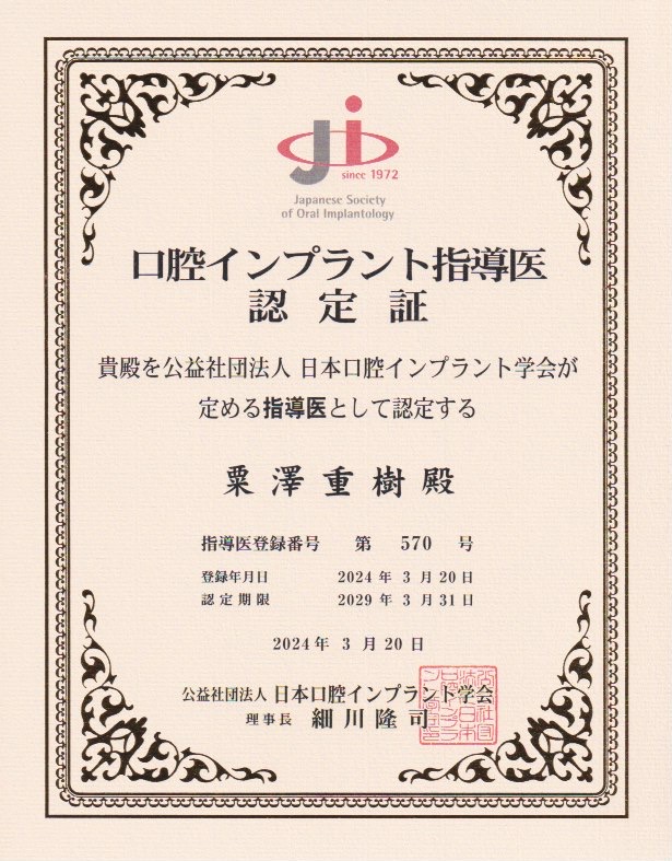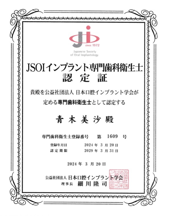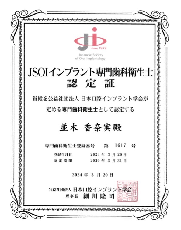日本口腔インプラント学会より院長が口腔インプラント指導医に認定されました。また、歯科衛生士の並木香奈実と青木美沙がインプラント専門歯科衛生士に認定され、当院在籍中のインプラント専門歯科衛生士が4名となりました。